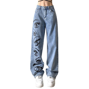 Portez ce jean bleu coupe droite et élégant pour afficher votre style. Confectionné en coton doux et résistant, il arbore un imprimé œil unique qui lui apporte une touche originale et originale. Disponible du S au L pour une coupe confortable et flatteuse, ce jean est idéal pour un quotidien élégant ou pour une soirée décontractée.