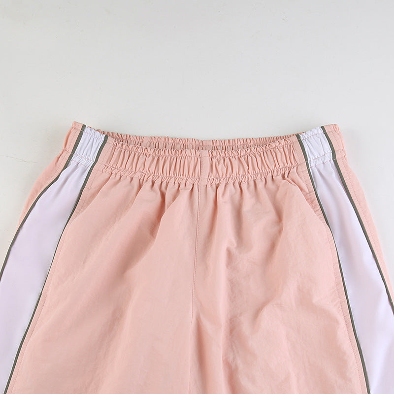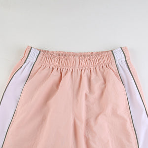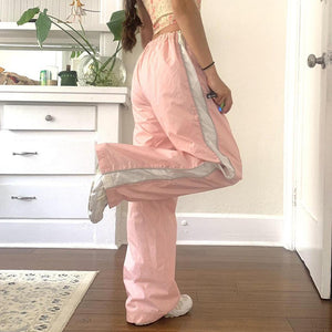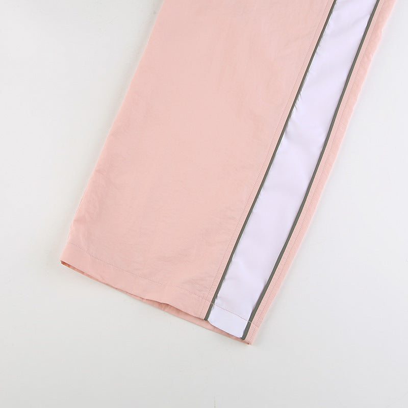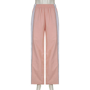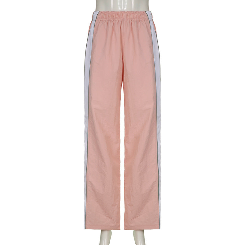 These women's elastic low-waist casual pants will keep you both comfortable and fashionable. They have a flexible waistband for all-day comfort and a straight-leg fit thanks to their soft polyester construction. While the pink hue offers a new, feminine vibe, the contrasting color details add a playful, contemporary touch. These trousers blend comfort, adaptability, and easy style, making them ideal for everyday wear, leisure activities, and lounging.
