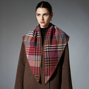 This autumn and winter wool triangle shawl will keep you warm and fashionable this winter. Measuring 80 × 135 cm for flexible draping, it is made of soft wool with a tie-dye finish and has a traditional red plaid houndstooth pattern. This shawl blends comfort and European-American street-inspired style with elegance, making it ideal for business, casual, or stylish OL ensembles.