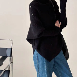 Made from soft polyester fiber for a smooth and cozy feel, this irregular turtleneck pullover sweater will keep you both stylish and cozy. Its distinctive turtleneck style and loose fit produce a sleek and attractive silhouette, and the solid color choices which include apricot, black, and star gray bring adaptable charm to any outfit. This sweater blends modern style with everyday comfort, making it ideal for casual outings or layering on cooler days.