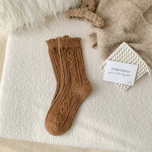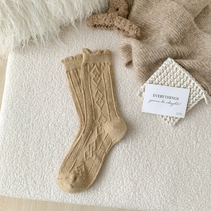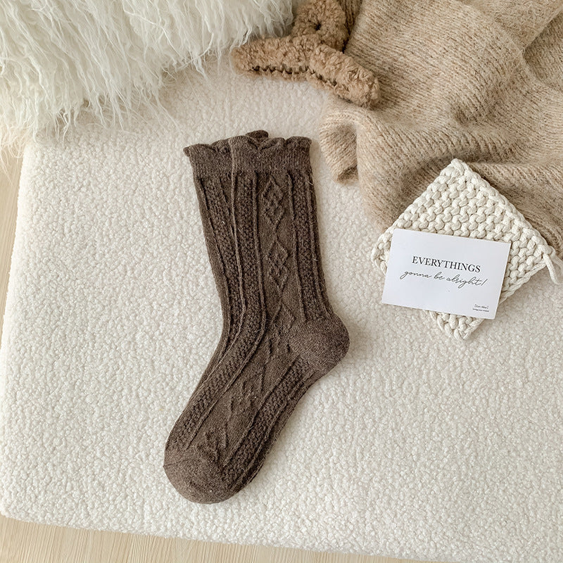 Embrace cozy elegance with these thickened diamond-pattern wool socks, perfect for the cool days of autumn and winter. Designed in a Japanese-inspired style, they feature a soft mid-rise fit that offers warmth and comfort while preventing friction. Available in a soothing milk curry color palette, black, light rice, light curry, burnt orange, dark curry, and caramel curry, these socks bring a refined touch to your everyday wardrobe while keeping your feet snug all season long