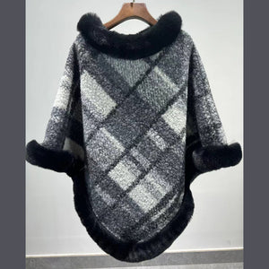 This mid-length plaid cloak with an opulent fur collar will add flair to your winter ensemble. The pullover cloak's European and American street-style design features batwing sleeves and a jacquard color grid pattern with rough-edge detailing for a stylish, textured appearance. Its 90cm width provides comfortable coverage while keeping you warm and fashionable on cold days. It comes in pink, coffee, caramel, black, and gray