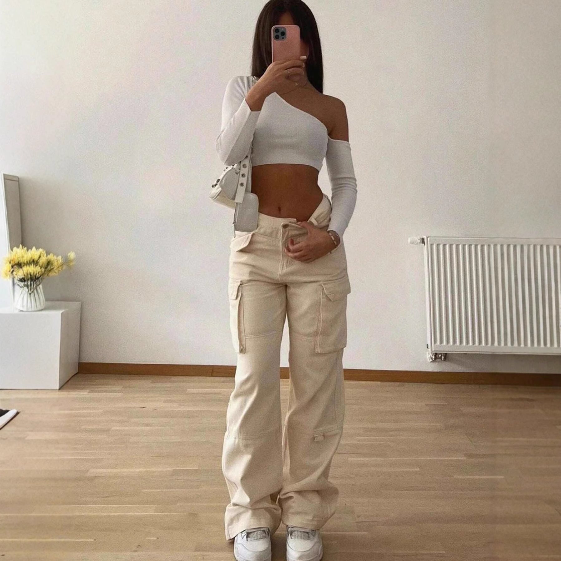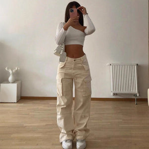 These multi-pocket mid-waist trousers combine sophisticated style with functionality. They have a slimming effect and a straight-leg silhouette thanks to their sturdy woven polyester construction. The practical pockets increase their everyday usefulness, and the apricot color adds a gentle, adaptable touch. These trousers add effortless elegance and contemporary convenience to your wardrobe, making them ideal for both casual outings and a sophisticated commute.