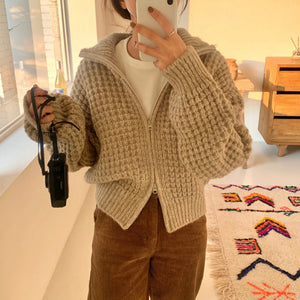 This thick high-neck sweater coat, which is made of a soft acrylic blend for long-lasting comfort and insulation, will keep you warm in style. It blends comfortable warmth with a carefree silhouette that is appropriate for daily wear thanks to its loose fit and traditional lapel collar. Long sleeves and a zipper closure make it functional, and the delicate splicing details give it a hint of vintage charm. This knitted cardigan is ideal for layering over casual attire because it provides comfort and classic style for chilly days.
