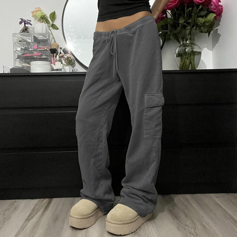 These straight-leg pants with American and European influences will keep you both comfortable and fashionable. They have a loose, mid-waisted fit that is ideal for casual workouts or daily wear because they are made of medium-thickness polyester with micro-elastic stretch. The gray color keeps the style adaptable and simple to pair with, while the lace-up detailing adds a subtle street-hipster edge. These pants, which come in sizes S to L, are a wardrobe staple for carefree casual style.