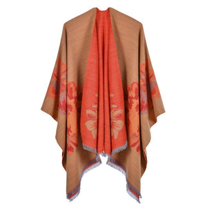 This European and American jacquard split shawl exudes effortless elegance. It provides warmth and comfort in any season because it is made of soft polyester yarn. The split silhouette facilitates effortless layering and elegant movement, while the double-sided design boasts elaborate floral patterns that offer depth and adaptability. This shawl adds a contemporary streetwear edge to any ensemble, whether it be elegant or casual, thanks to its broad, extended style and vibrant color options