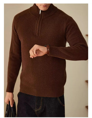 This men's business leisure wool sweater, appropriate for both casual and professional settings, offers sophisticated comfort. Made entirely of high-quality wool, it feels soft against the skin and provides natural warmth and breathability. A contemporary, adaptable edge is added by the half-height zipper collar, which makes temperature control and layering simple. This solid-colored sweater, which comes in sophisticated coffee and tea, camel, and grey hues, combines classic elegance with fashion city style, making it ideal for the modern gentleman.