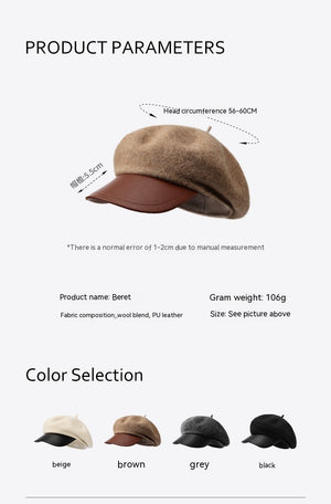 This painter's hat, made of a wool blend, will add flair to your winter ensemble while providing wind protection and warmth. It is a versatile addition to any ensemble thanks to its timeless dome shape and retro artistic style, which combines French and British influences. Most people will find a comfortable fit thanks to the free-size design and classic colors like black, beige, brown, and gray. This beret blends easy vintage charm with cozy warmth, making it ideal for winter