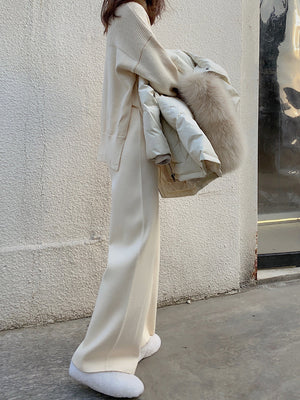 These knitted wide-leg pants for fall and winter will keep you warm and fashionable this season. They have a high waist and a drooping mop-style silhouette for a loose, attractive fit. They are made of soft, thick acrylic fiber with medium elasticity. These adaptable pants, which come in cream white, linen, milk brown, and black, are ideal for both casual get-togethers and a stylish commute. For warmth and carefree style in the winter, wear them with sweaters or layered tops.
