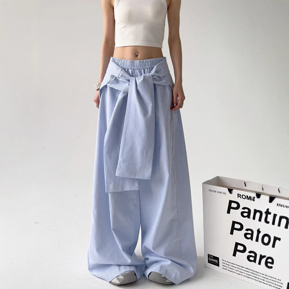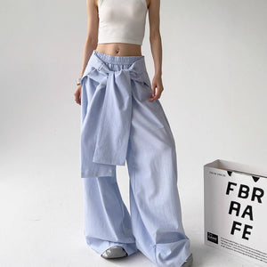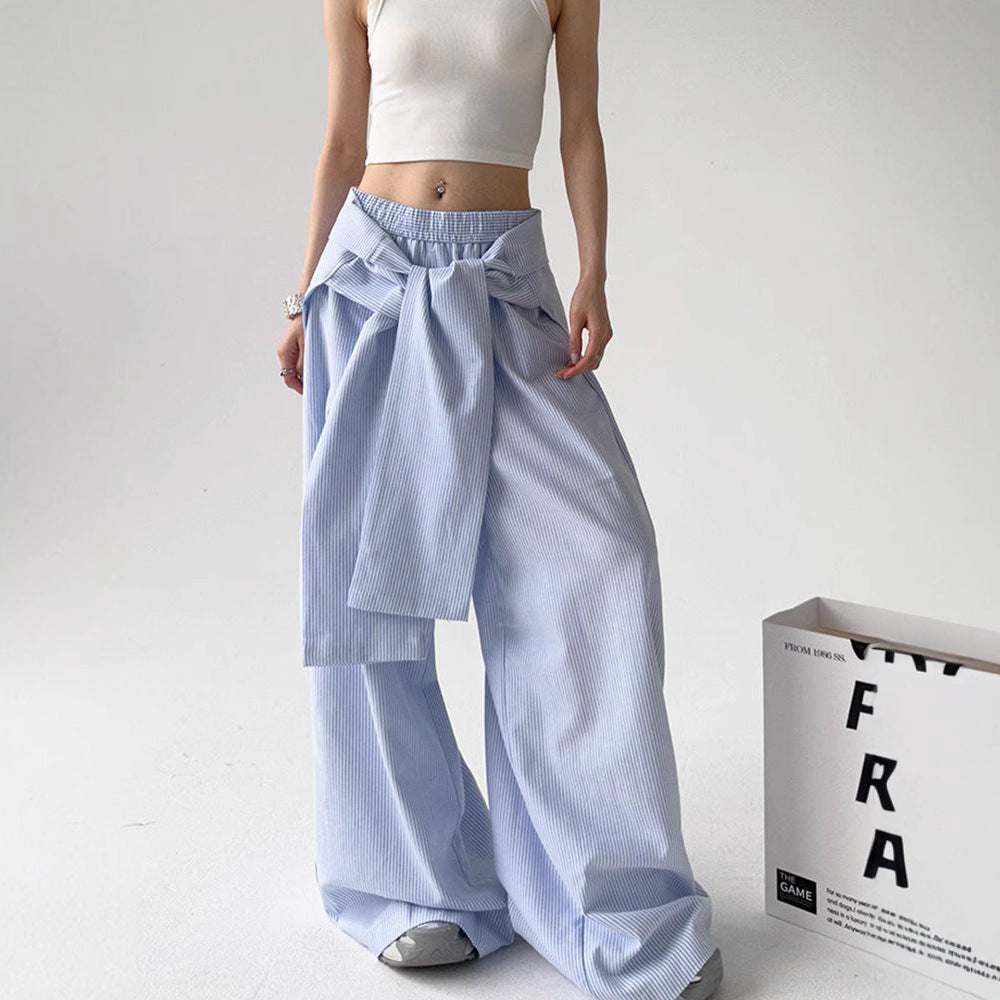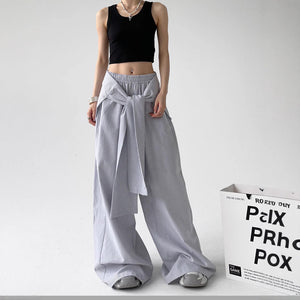 These lace-up loose straight pants, which are made for a contemporary, fashion-forward look, will help you make a bold street-style statement. Made of lightweight polyester, they have a straight-leg silhouette that flows naturally and a comfortable loose waist. The adaptable blue and gray hues make them simple to match with tops or jackets, and the delicate striped pattern and adjustable lace-up straps add a distinctive design element. These pants blend comfort and distinctive style, making them ideal for laid-back get-togethers or fashionable city ensembles.