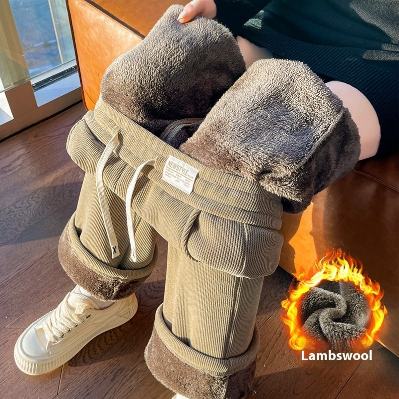 These women's wide-leg, chenille fleece-lined pants will keep you warm and fashionable this fall and winter. They have a high waist, spacious pockets for comfort and functionality, and are made of soft, medium-elasticity lambswool. The wide-leg cut produces a loose, attractive silhouette, and the incredibly thick fabric offers comfortable insulation. These pants come in a range of timeless hues and are ideal for easy daily wear or casual commuting. Their non-ironing finish adds warmth, style, and ease of maintenance.