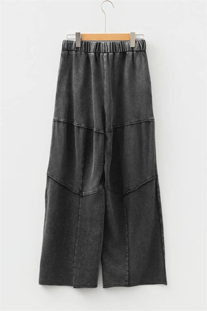 With their tiered patchwork design and bold, modern style, these black mineral-wash wide-leg pants are sure to turn heads. Made from a cozy cotton and polyester blend, they have a drawstring waist for adjustable comfort and a loose fit. These pants are ideal for casual get-togethers or stylish daily wear because of their distinctive patchwork detailing and flowing silhouette, which effortlessly add a street-style vibe. Sizes S to XL are available.