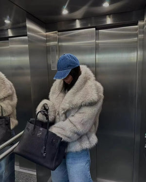 Designed in the European and American socialite style for sophisticated winter wear, this mink-like artificial fur coat exudes elegance. Long sleeves and a regular fit make it comfortable, and the medium-thickness imitation fur keeps you warm without adding bulk. It is ideal for high-end events or fashionable daily outings because of its 50cm short length and ice cream-inspired color accents, which add a chic, contemporary touch. This one-piece coat, which comes in greige and black and is expertly stitched with high-quality imitation fur, adds sophistication to any wardrobe