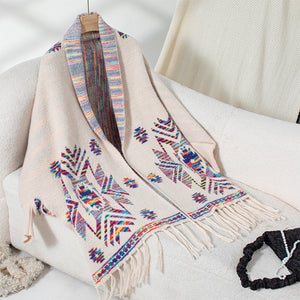This geometric jacquard tassel shawl will add flair to your streetwear. Its soft polyester construction, loose, comfortable fit, and elaborate jacquard patterns add a stylish, ethnically inspired touch. Its adaptable European and American-inspired design makes it ideal for layering over both casual and fashionable ensembles, while the whimsical tassels add movement and flair. This shawl, which comes in khaki, pink, apricot, and black, blends coziness, coziness, and modern style