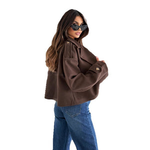 With its stylish Japanese and Korean casual design, this women's solid color short woolen coat will add flair to your everyday ensemble. Its soft woolen fabric provides warmth and comfort without adding bulk, making it ideal for layering during the cooler months. The simple solid hues of wine red, dark brown, and khaki go well with dresses, skirts, and jeans for a put-together yet carefree look. This coat adds subtle elegance to any casual wardrobe with its cropped silhouette and straightforward long-sleeve design