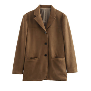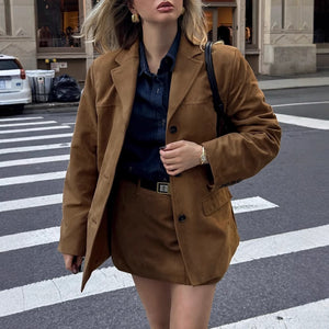 With this stylish single-breasted suit set, which includes a fitted coat and matching short skirt, you can create a chic street-style look. The set, which has a polished silhouette and a comfortable fit, is made of sturdy polyester fiber. Its solid color scheme guarantees adaptability, making it simple to combine with other items in your wardrobe. This set blends contemporary fashion with easy elegance for modern women, making it ideal for both stylish events and casual get-togethers