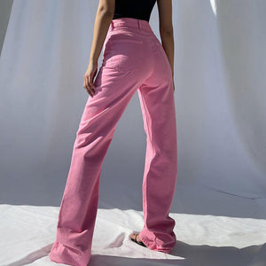 Bär dessa slitna, vida jeans med hög midja för damer för att gå ut med stil. De har en avslappnad, tvättad look och knappdetaljer för extra stil. De är tillverkade av en mysig denimblandning av polyester och bomull. De är perfekta för urbana, avslappnade ensembler tack vare sin mjuka rosa nyans och lösa passform, som är avsedd att framhäva unga damer mellan 18 och 24 år som har en modern och trendig look.